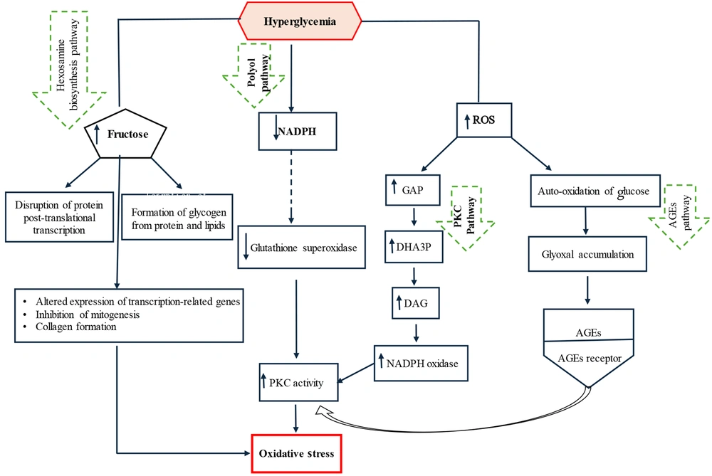 The hexosamine pathway plays a role in the metabolism of fructose-6-phosphate derived from glycolysis. Hyperglycemia, by increasing the flux of fructose-6-phosphate into the hexosamine pathway, affects the activity of mediators and enzymes involved in the post-translational modification of proteins (20). This leads to increased expression of transcription factors such as transforming growth factor-beta (TGF-β), resulting in the inhibition of mitogenesis in kidney, liver, heart, and brain cells, activation of collagen matrix proliferation, and basement membrane thickening. Thus, diabetes-induced disorders in vital body tissues are exacerbated (14). The polyol pathway is a minor, low-activity route for glucose metabolism under normal conditions, but under hyperglycemia, it significantly impacts glucose metabolism. The activity of this pathway depletes NADPH, leading to a weakened antioxidant defense system and increased oxidative stress (21). Additionally, by increasing fructose accumulation, it elevates the formation of methylglyoxal as an AGE precursor and ultimately stimulates oxidative stress by activating the PKC pathway (2). Figure 1 illustrates the signaling pathways through which hyperglycemia increases oxidative stress.