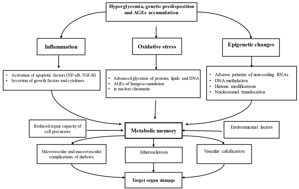 Glycemic memory is a pathophysiological phenomenon in which the initial accumulation of AGEs and ROS due to hyperglycemia establishes a foundation for the long-term development and progression of diabetic complications. This occurs through the induction of persistent epigenetic changes and chronic inflammation and oxidative stress, even if glycemic control is later optimized (27). Thus, a concept broader than blood glucose control, known as metabolic memory, emerges, encompassing wider epigenetic dimensions. Metabolic memory challenges conventional treatments for metabolic diseases. Consequently, despite achieving optimal glycemic control with glucose-lowering medications, organisms may continue to exhibit inflammatory responses and related complications due to metabolic memory (49). The persistence of adverse effects from metabolic memory — such as inflammatory changes, premature cellular aging, and apoptosis — varies depending on the source, extent, and duration of the stimulus. It may even trigger potentially fatal complications after maintaining near-normal glucose levels (25, 33).