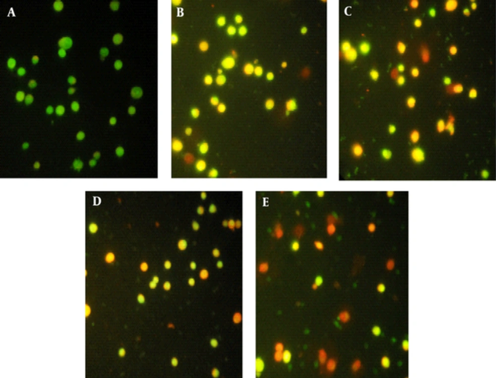 Advent of orange color revealed apoptosis in the response of treatment with sea cucumber extract and gamma radiation. Results exhibited that sea cucumber extract induced cervical cancer cell radiation sensitivity and apoptosis in a dose dependent manner (A: control, B: 50 sc, C: 100 sc, D: 25 sc + rad, E: 50 sc + rad) (Figure 3).