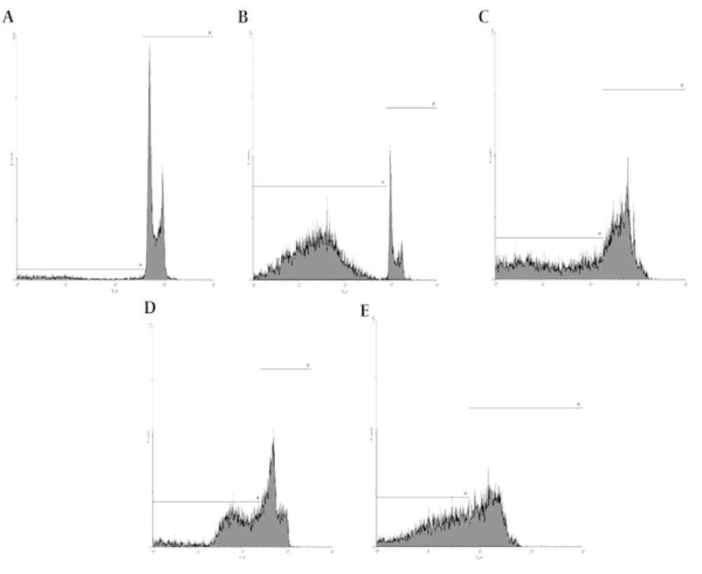 Simultaneously effect of gamma radiation and sea cucumber methanol extract induced apoptosis cervical cell death: The apoptosis cell death was measured with flow cytometry histogram of PI and acridine orange staining. Sea cucumber extract (0 - 100 μg/mL) increased a sub-G1 peak in treated cells (B: 50 sc, C: 100 sc, D: 25sc + rad, E: 50 sc + rad) compared with untreated cells (A) suggesting loss of membrane integrity involved in its toxicity (Figure 2).