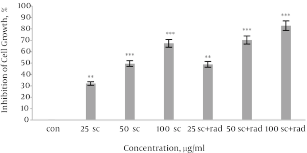 Anti proliferative effect of the sea cucumber extract and gamma radiation against the cervical cancer cell line (HeLa) was investigated by 3-(4, 5-dimethylthiazol-2-yl) -2, 5-diphenyltetrazolium bromide (MTT) assay. For designation of this in vitro experiment, we cultured cells in 2 plates overnight, then the cells of 2 plates, were exposed with different concentrations of the sea cucumber extract (0 to 100 μg/mL) for 24 hours. After desired time, one plate irradiated by 2 gray (Gy) of γ-rays. Then both of plates (irradiated and non-irradiated) incubated for 66 hours in Co2 incubator. Then MTT solution (5 mg/mL in PBS or Phosphate Buffer Saline) was added to each well for 4 h. Finally MTT solution was discarded and100 μL of DMSO (DiMethyl Sulfoxide) was added to each well to resulting formazan was solubilized with DMSO (100 μL) and absorbance was measured at 560 nm in spectrophotometer (Epoch, USA).