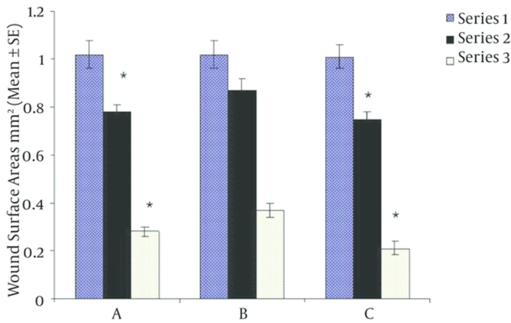 Based on One way ANOVA and Bonferroni statistical testes at first, body weight and wound surface area among all groups did not show any differences but blood glucose in diabetics groups (A and B) was significantly higher than control group (C). Results were expressed as Mean ± SD, P < 0.00001.